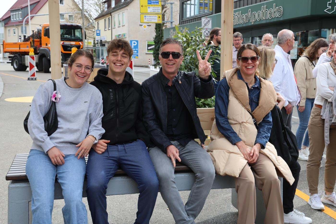 Bei der Begehung zeigte sich, wie sehr sich die Karl- und Wilhelmstraße, durch die sonst 14.000 Fahrzeuge fahren, geändert haben. Es ist ruhiger geworden, große farbige Punkte auf der Fahrbahn brechen den Verkehrsraum auf und lassen Straße und Gehweg verschmelzen. Zahlreiche Sitzmöbel, viele als Leihgabe im Rahmen des Projekts Ortsmitten BW zur Verfügung gestellt durch das baden-württembergische Verkehrsministerium, wurden von den Besucherinnen und Besuchern, die für das Foodtruck-Festival des Stadtmarketingvereins bzw. dem verkaufsoffenen Sonntag gekommen waren, für ein Ruhepäuschen genutzt.