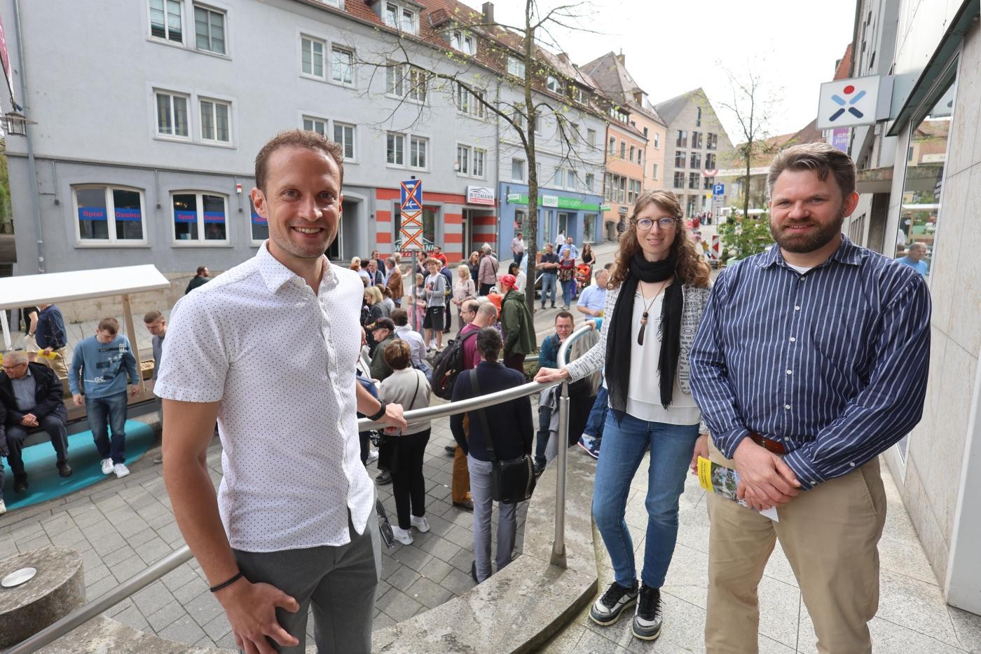 Ähnlich sah dies auch Stefanie Dowy vom Projektteam, die gemeinsam mit Daniel Czybulka im Anschluss an die Eröffnung die rund 100 Personen große Gruppe durch den Bereich führte. „Unsere Innenstadt zeigt sich nun mit einem neuen Gesicht“, fasste sie es zusammen. Ihr Dank richtete sich auch an den örtlichen Einzelhandel sowie der Gastronomie, die gemeinsam den ehemaligen Straßenraum nun mit Leben füllen wollen. Dowy verwies auf das Veranstaltungsprogramm, das im Rahmen der temporären Fußgängerzone auf mehreren Aktionsflächen stattfinden wird. Auf der Internetseite der Stadt, einer Informationstafel im Container auf dem Marktplatz sowie auf gedruckten Flyern finden Interessierte alle Termine für die kommenden Wochen.